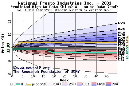 The high to date and low to date prices of the stock plotted against a random walk model for 2001 (what's this?).