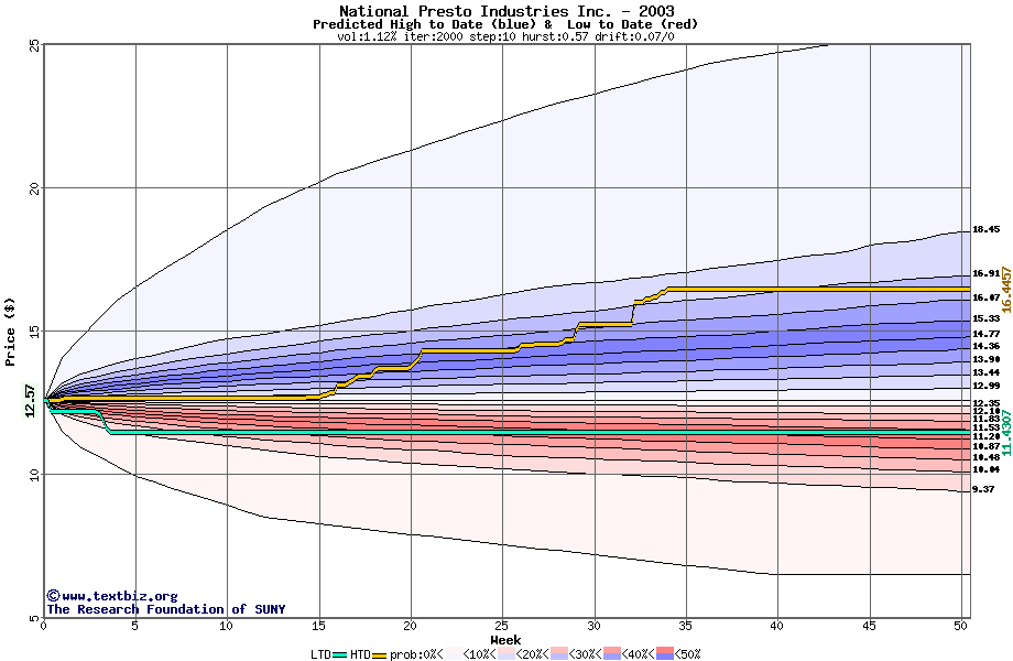 The high to date and low to date prices of the stock plotted against a random walk model for 2003 (what's this?).