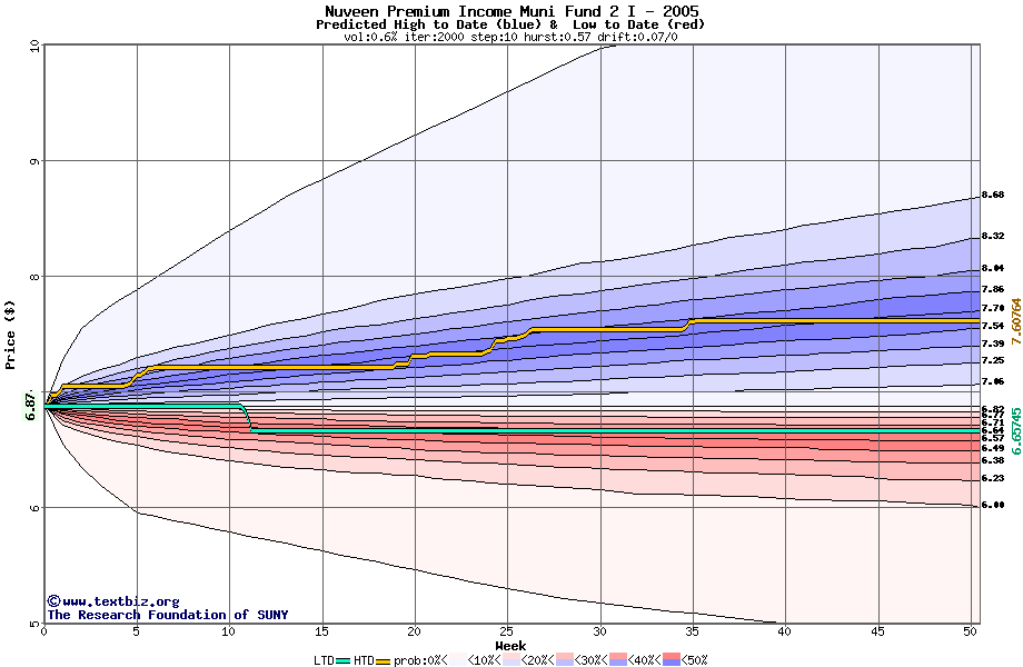 The high to date and low to date prices of the stock plotted against a random walk model for 2005 (what's this?).