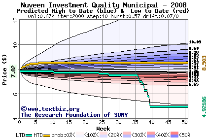 The high to date and low to date prices of the stock plotted against a random walk model for 2008 (what's this?).