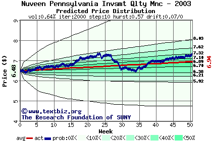 The high to date and low to date prices of the stock plotted against a random walk model for 2003 (what's this?).