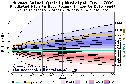 The high to date and low to date prices of the stock plotted against a random walk model for 2009 (what's this?).
