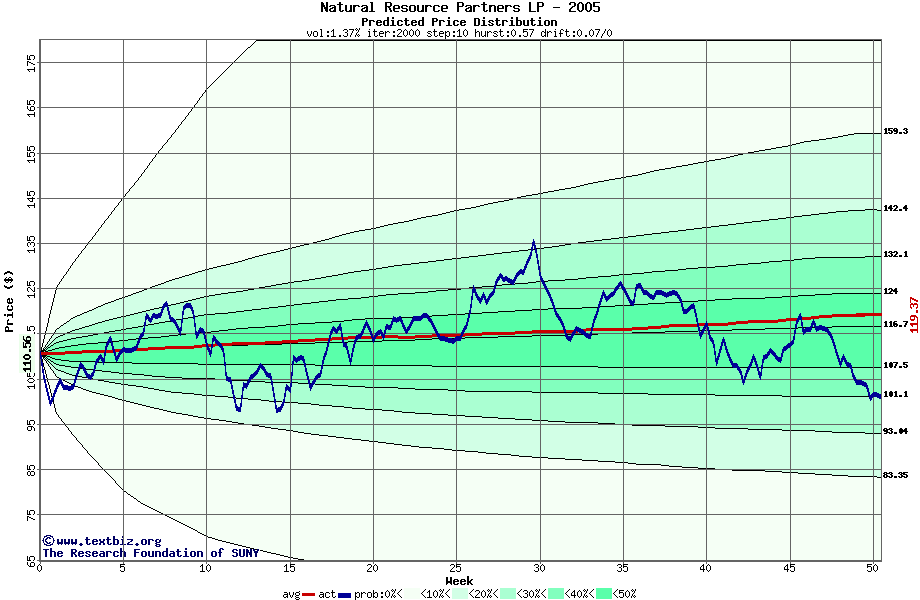The following graph plots the year-to-date performance of the stock for 2005 compared to the probability calculated by a random walk model.