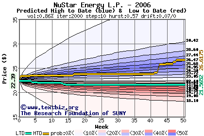 The high to date and low to date prices of the stock plotted against a random walk model for 2006 (what's this?).