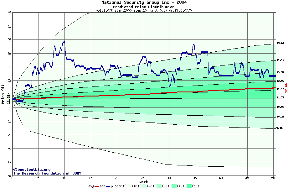 The following graph plots the year-to-date performance of the stock for 2004 compared to the probability calculated by a random walk model.
