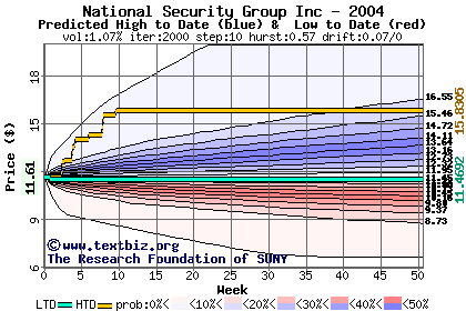 The high to date and low to date prices of the stock plotted against a random walk model for 2004 (what's this?).
