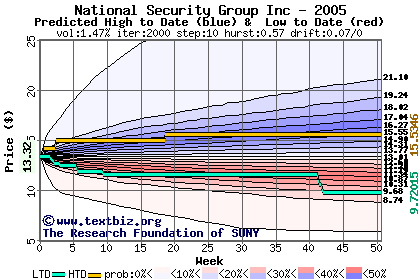 The high to date and low to date prices of the stock plotted against a random walk model for 2005 (what's this?).