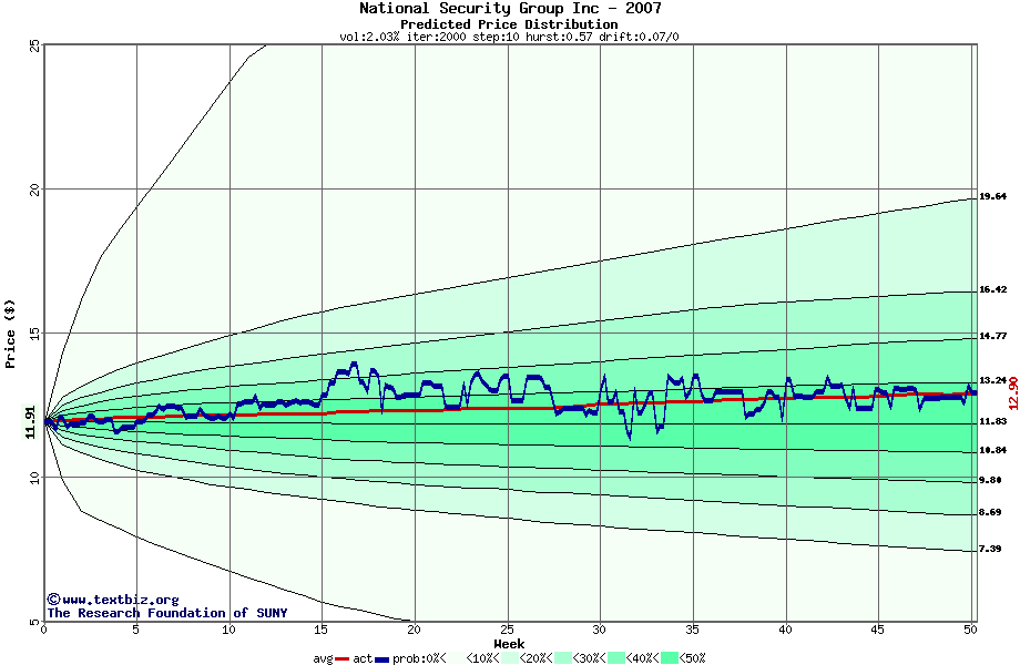 The following graph plots the year-to-date performance of the stock for 2007 compared to the probability calculated by a random walk model.
