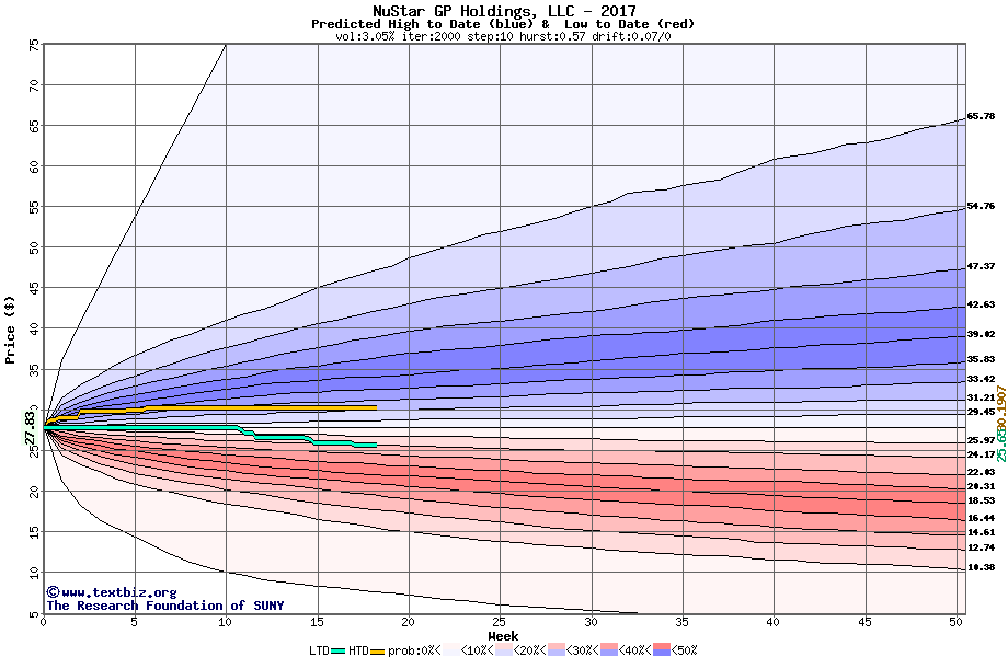 The high to date and low to date prices of the stock plotted against a random walk model for 2017 (what's this?).