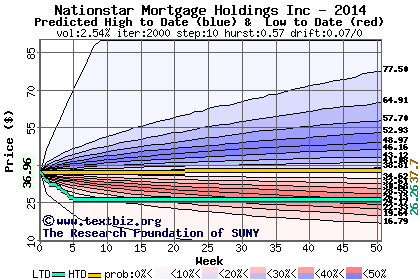 The high to date and low to date prices of the stock plotted against a random walk model for 2014 (what's this?).