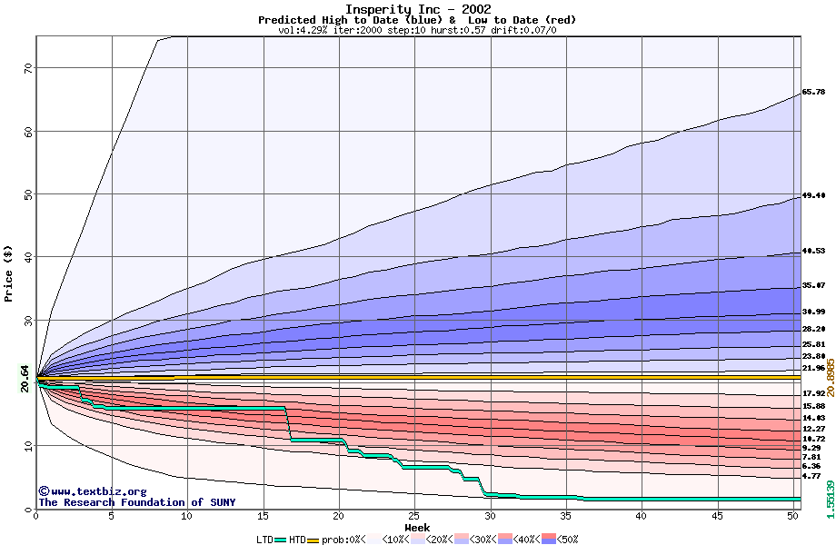 The high to date and low to date prices of the stock plotted against a random walk model for 2002 (what's this?).