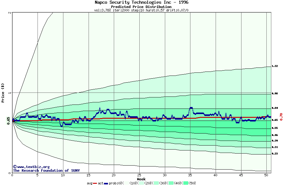 The following graph plots the year-to-date performance of the stock for 1996 compared to the probability calculated by a random walk model.