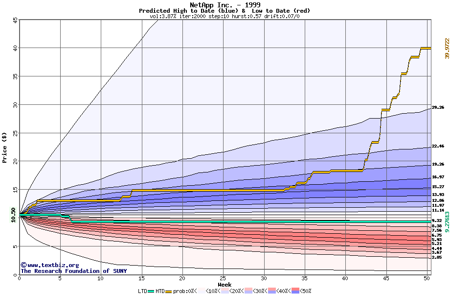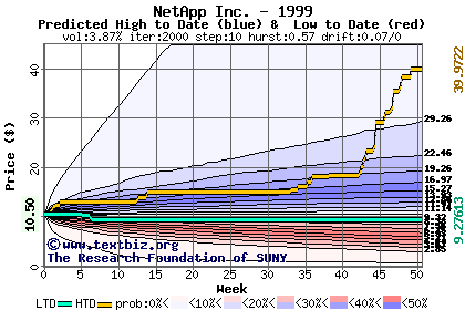 The high to date and low to date prices of the stock plotted against a random walk model for 1999 (what's this?).