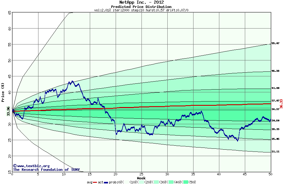 The following graph plots the year-to-date performance of the stock for 2012 compared to the probability calculated by a random walk model.