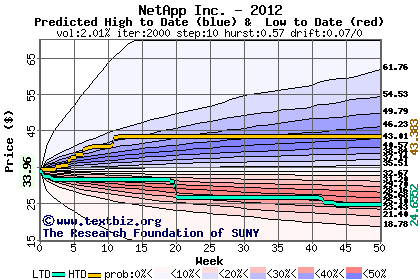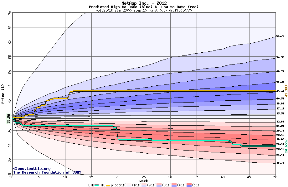 The high to date and low to date prices of the stock plotted against a random walk model for 2012 (what's this?).
