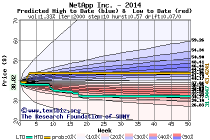 The high to date and low to date prices of the stock plotted against a random walk model for 2014 (what's this?).