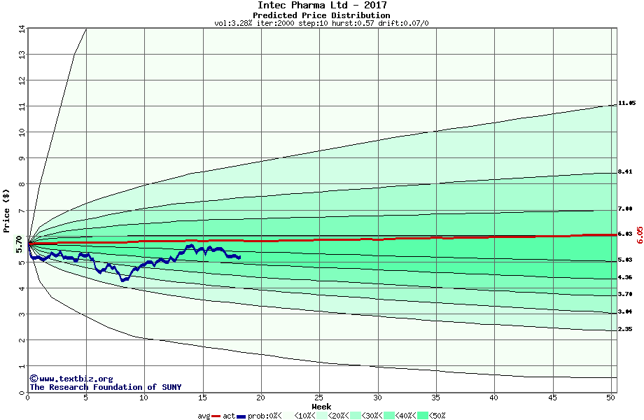The following graph plots the year-to-date performance of the stock for 2017 compared to the probability calculated by a random walk model.