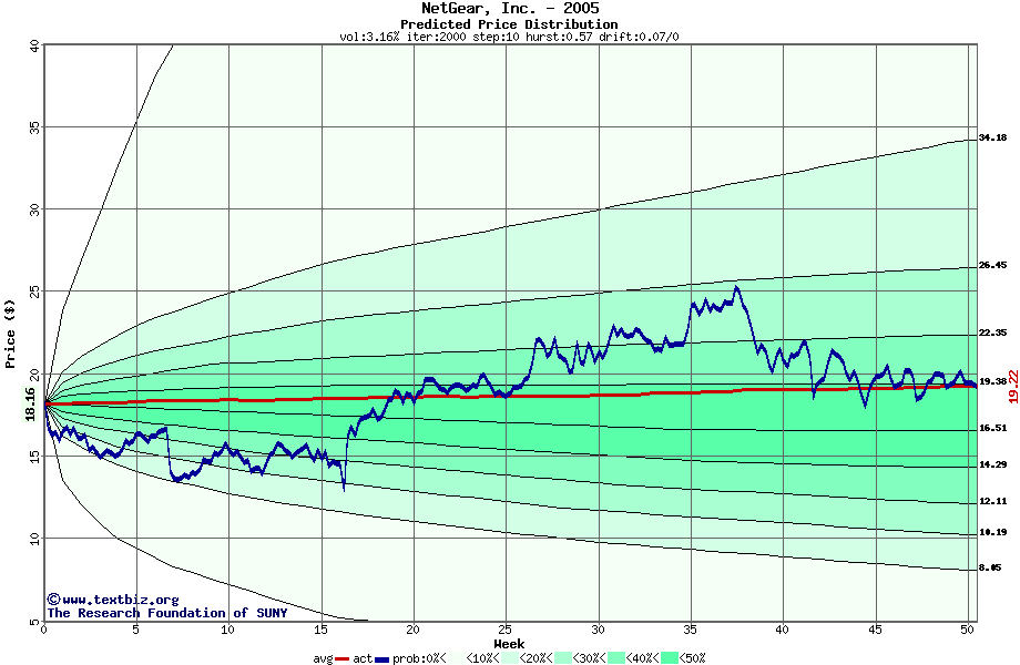 The following graph plots the year-to-date performance of the stock for 2005 compared to the probability calculated by a random walk model.