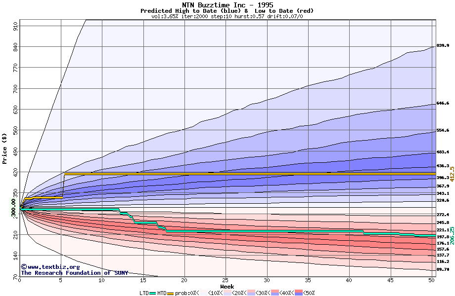 The high to date and low to date prices of the stock plotted against a random walk model for 1995 (what's this?).