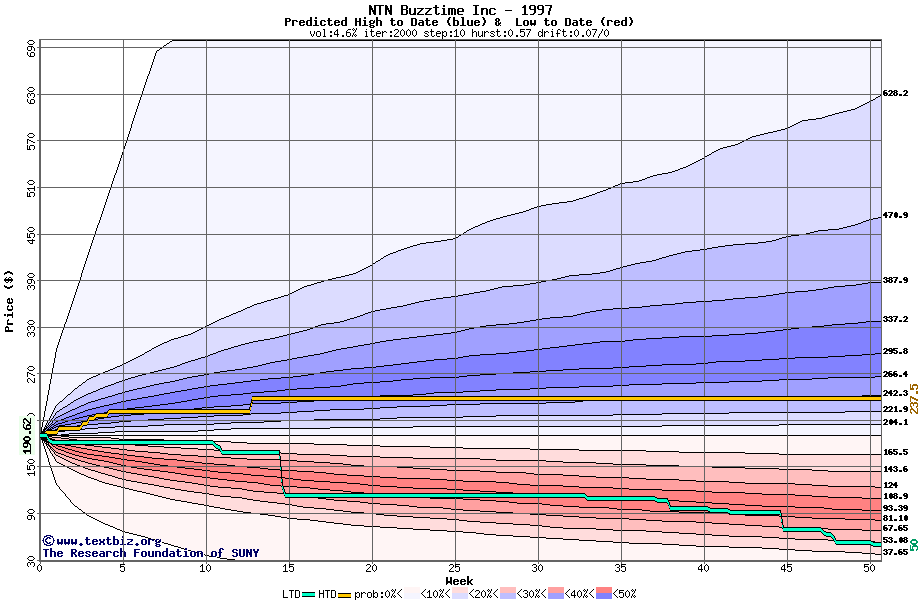 The high to date and low to date prices of the stock plotted against a random walk model for 1997 (what's this?).