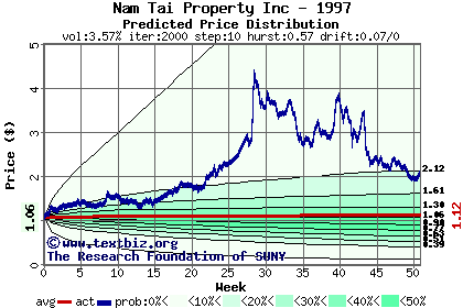 The high to date and low to date prices of the stock plotted against a random walk model for 1997 (what's this?).
