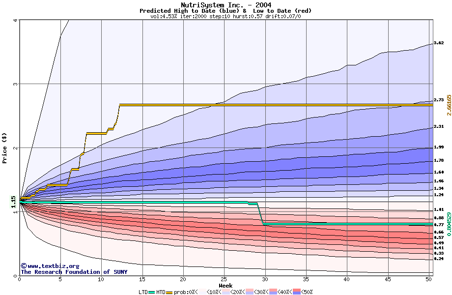 The high to date and low to date prices of the stock plotted against a random walk model for 2004 (what's this?).