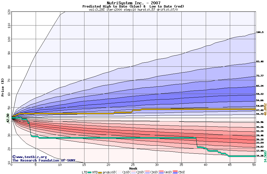 The high to date and low to date prices of the stock plotted against a random walk model for 2007 (what's this?).