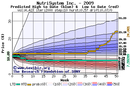 The high to date and low to date prices of the stock plotted against a random walk model for 2009 (what's this?).