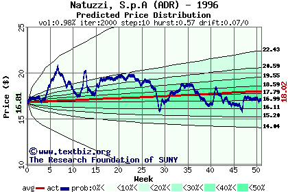The high to date and low to date prices of the stock plotted against a random walk model for 1996 (what's this?).