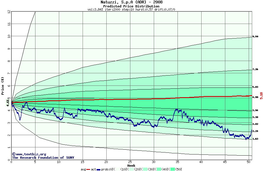 The following graph plots the year-to-date performance of the stock for 2008 compared to the probability calculated by a random walk model.