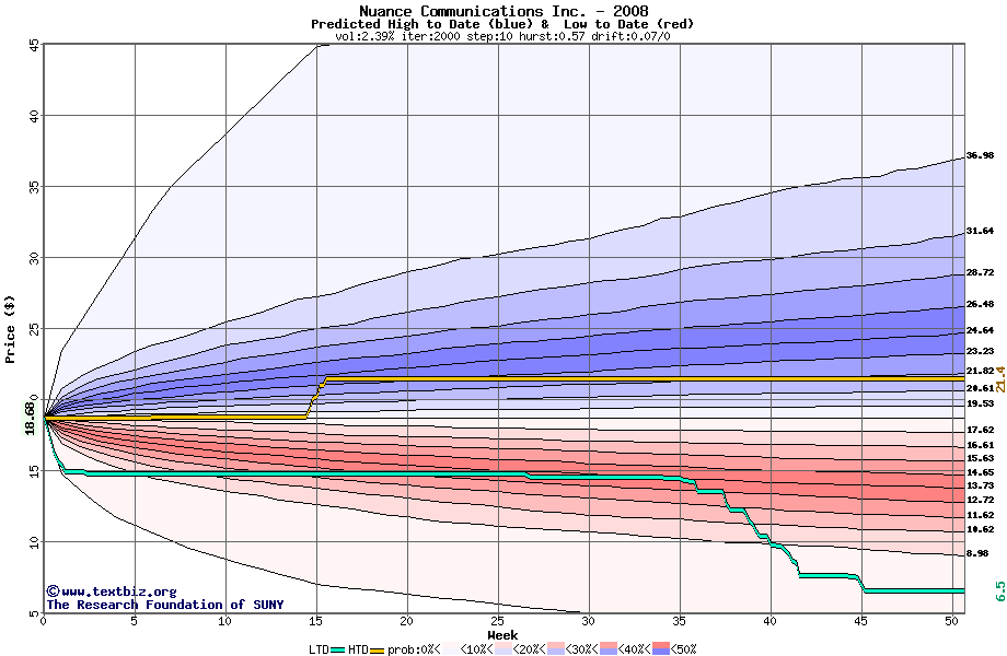 The high to date and low to date prices of the stock plotted against a random walk model for 2008 (what's this?).