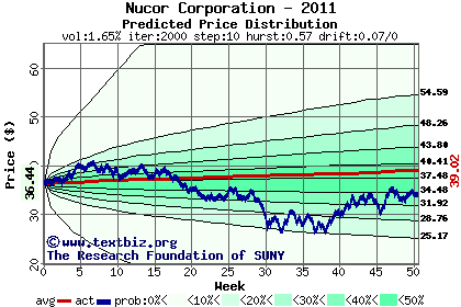 The high to date and low to date prices of the stock plotted against a random walk model for 2011 (what's this?).