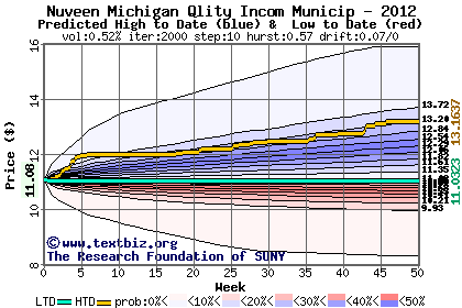The high to date and low to date prices of the stock plotted against a random walk model for 2012 (what's this?).