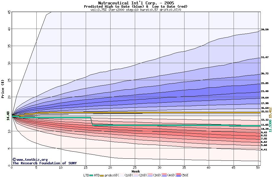 The high to date and low to date prices of the stock plotted against a random walk model for 2005 (what's this?).