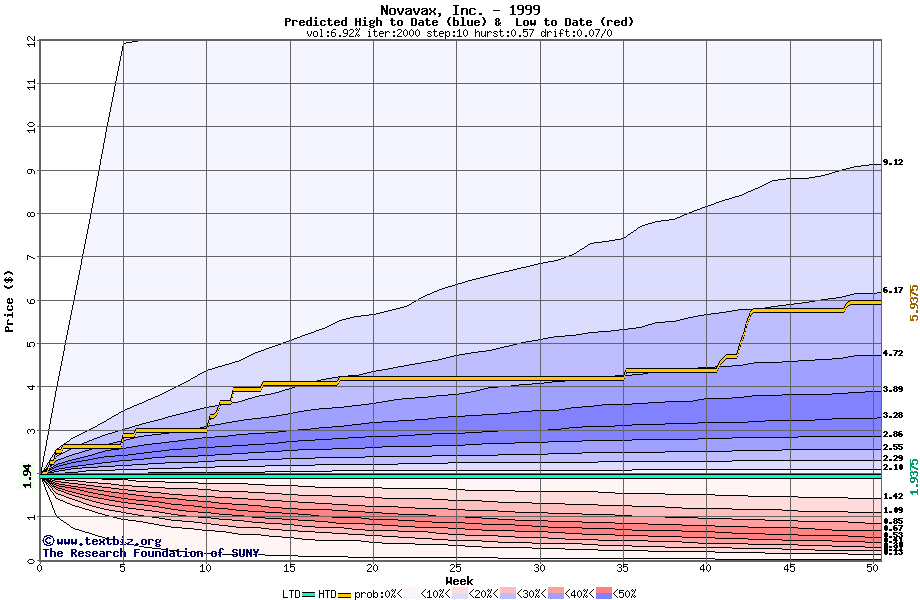 The high to date and low to date prices of the stock plotted against a random walk model for 1999 (what's this?).