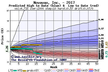 The high to date and low to date prices of the stock plotted against a random walk model for 2017 (what's this?).