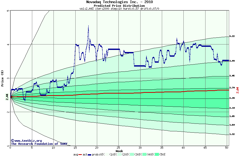 The following graph plots the year-to-date performance of the stock for 2010 compared to the probability calculated by a random walk model.
