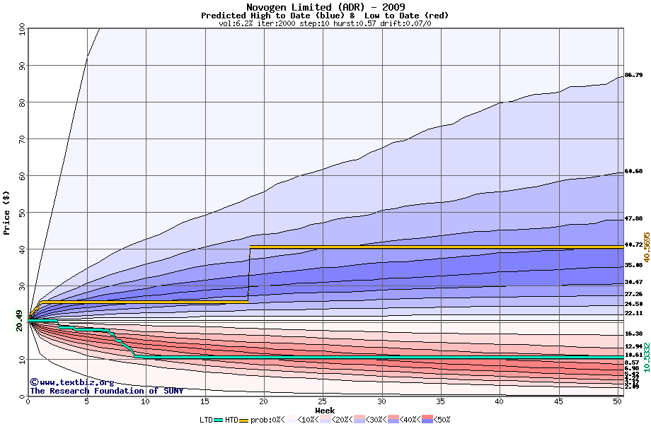 The high to date and low to date prices of the stock plotted against a random walk model for 2009 (what's this?).