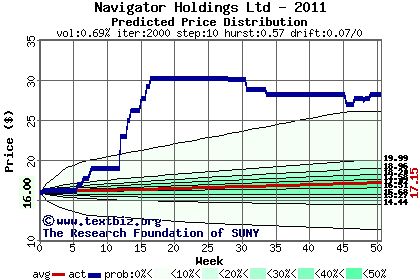 The high to date and low to date prices of the stock plotted against a random walk model for 2011 (what's this?).