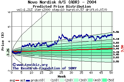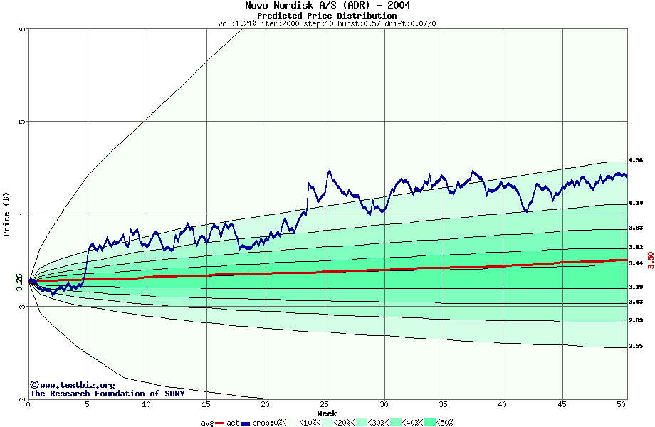 The following graph plots the year-to-date performance of the stock for 2004 compared to the probability calculated by a random walk model.