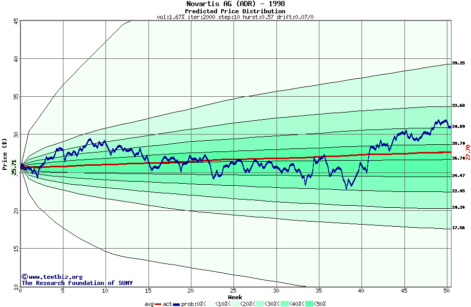 The following graph plots the year-to-date performance of the stock for 1998 compared to the probability calculated by a random walk model.