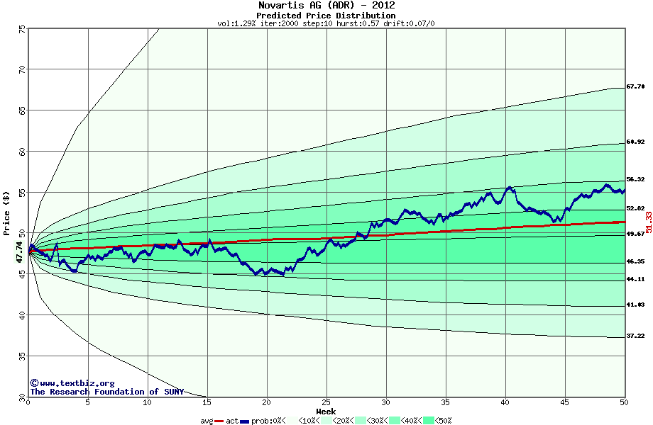 The following graph plots the year-to-date performance of the stock for 2012 compared to the probability calculated by a random walk model.