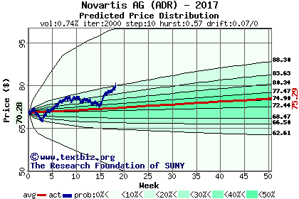 The high to date and low to date prices of the stock plotted against a random walk model for 2017 (what's this?).
