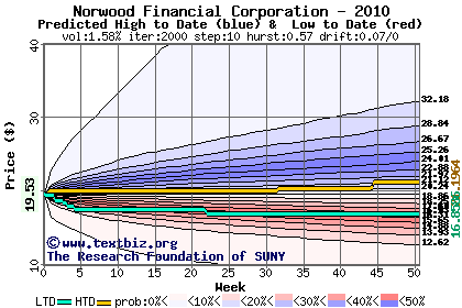 The high to date and low to date prices of the stock plotted against a random walk model for 2010 (what's this?).