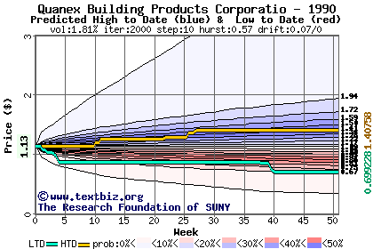 The high to date and low to date prices of the stock plotted against a random walk model for 1990 (what's this?).