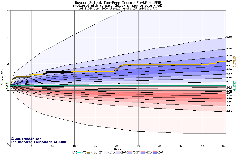 The high to date and low to date prices of the stock plotted against a random walk model for 1995 (what's this?).