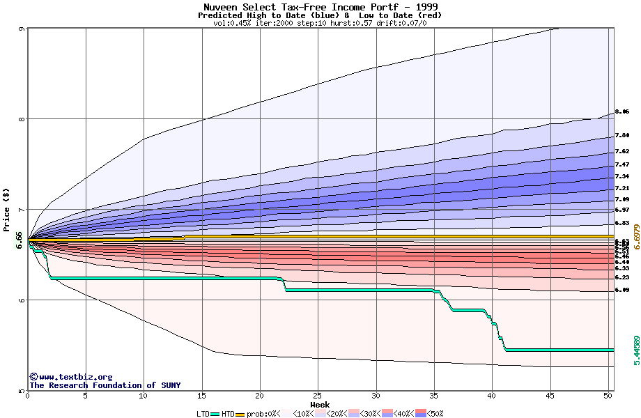 The high to date and low to date prices of the stock plotted against a random walk model for 1999 (what's this?).
