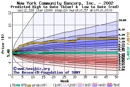 The high to date and low to date prices of the stock plotted against a random walk model for 2002 (what's this?).