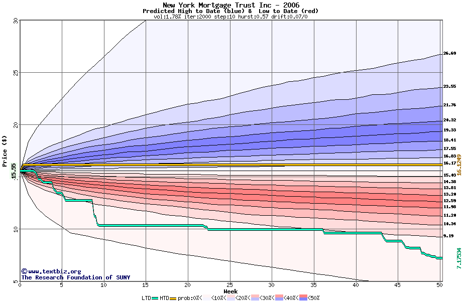 The high to date and low to date prices of the stock plotted against a random walk model for 2006 (what's this?).