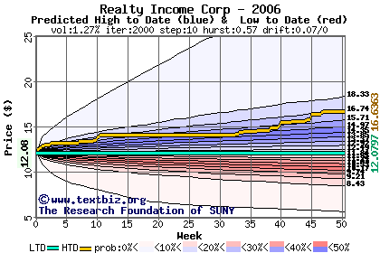 The high to date and low to date prices of the stock plotted against a random walk model for 2006 (what's this?).